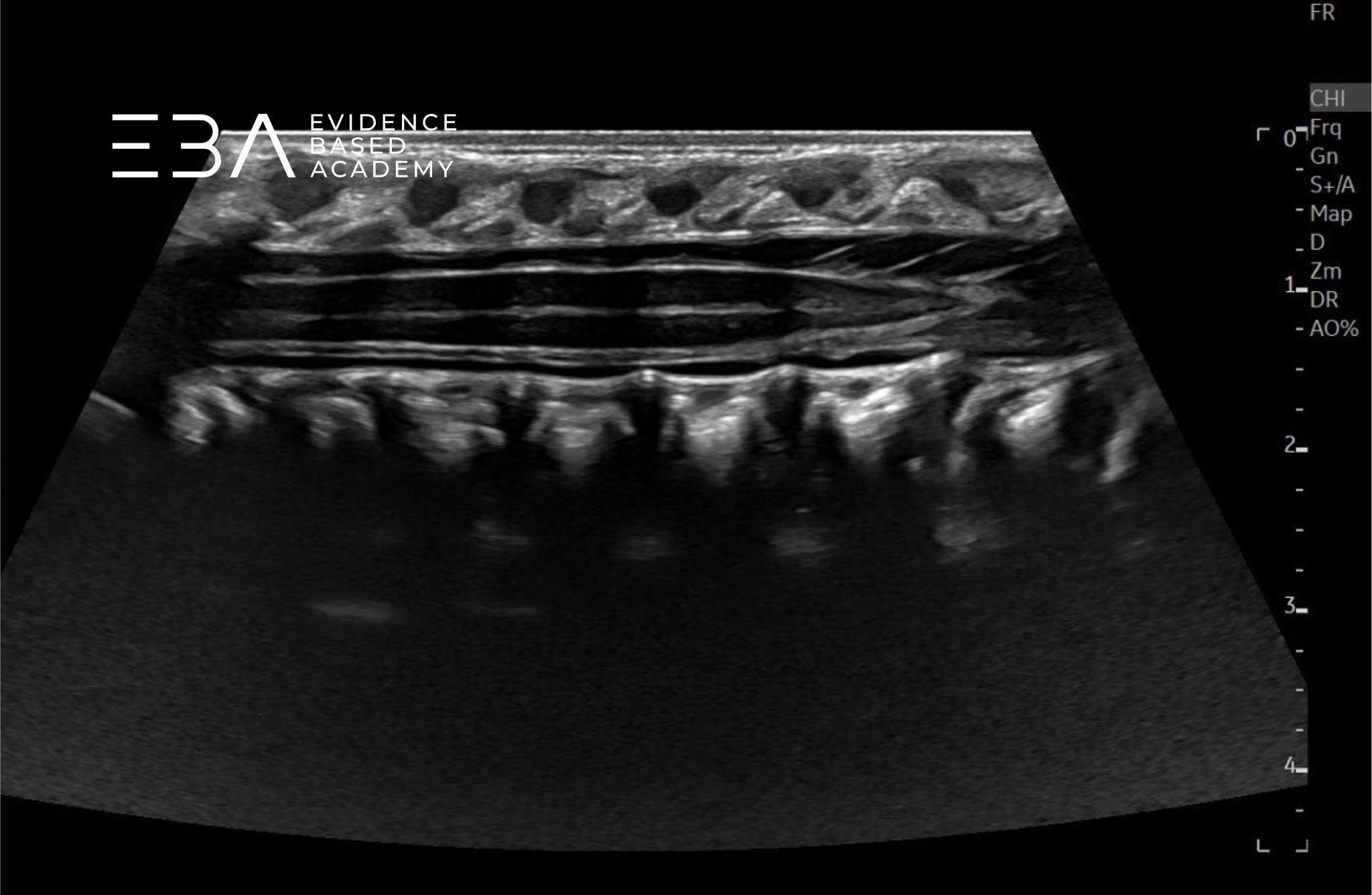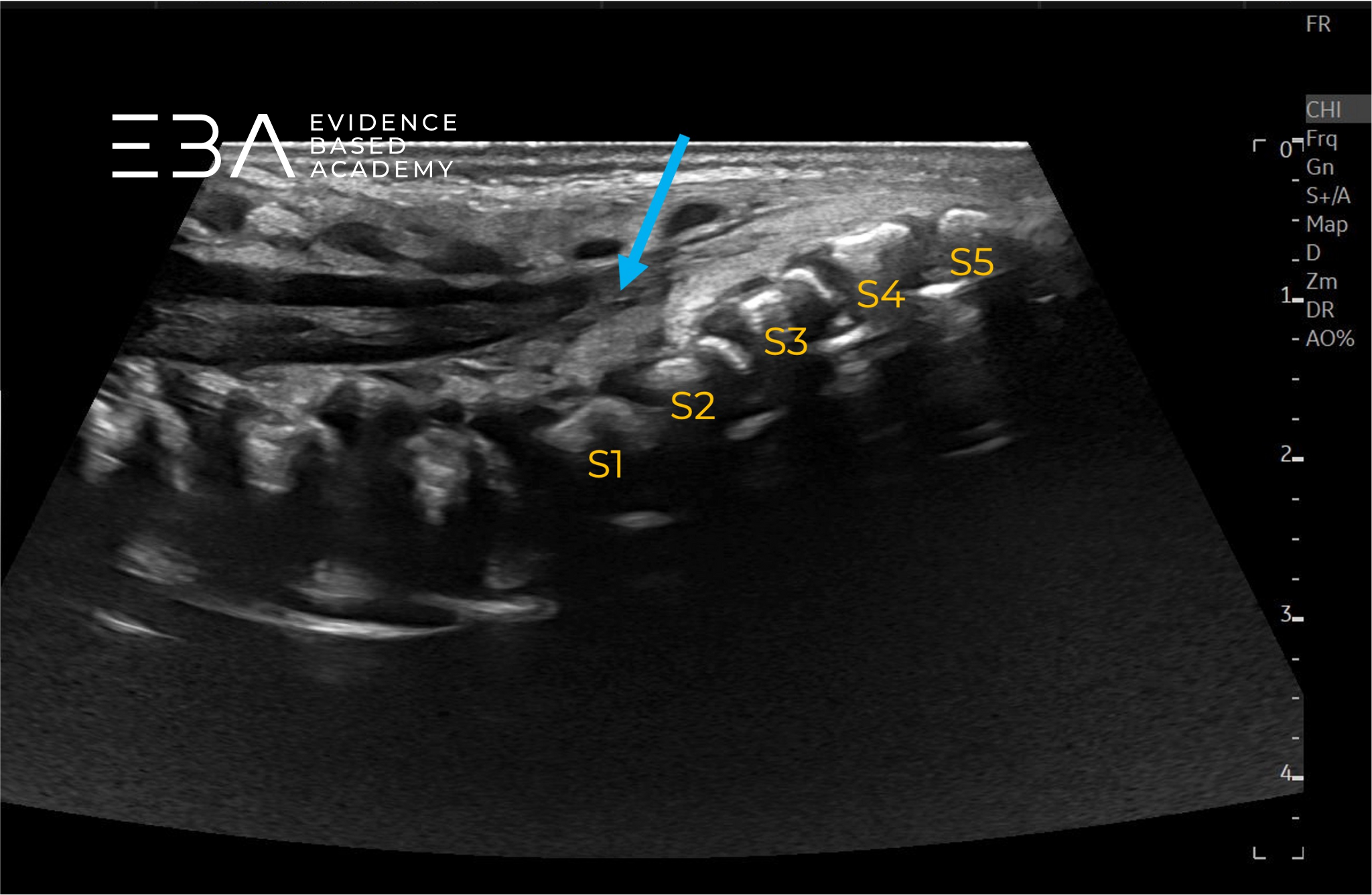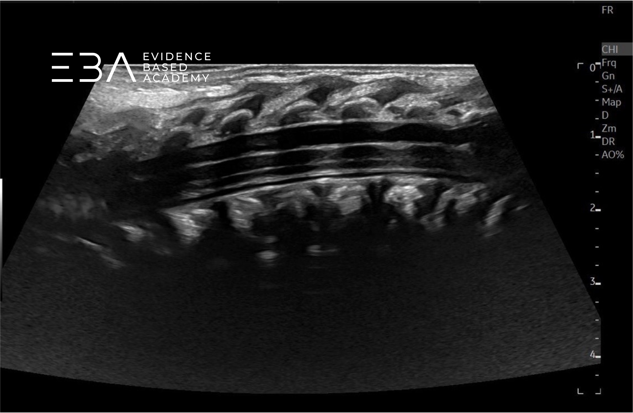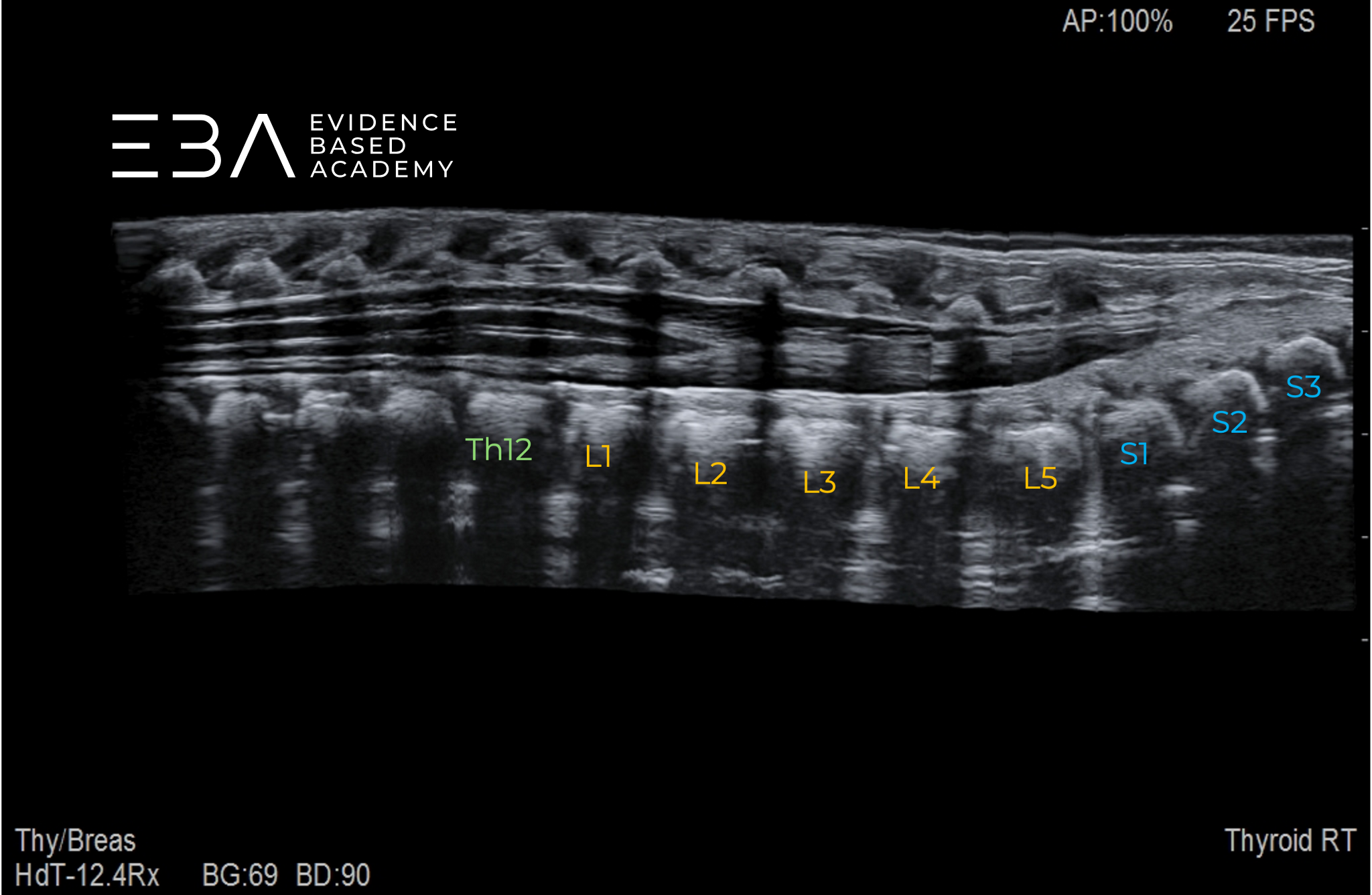 Typowa głębokość obrazowania wynosi 3-5 cm, a strefę ogniskowania ustawia się na 1,5-2,5 cm. Wzmocnienie należy dostosować tak, aby umożliwić wyraźne różnicowanie struktur wewnątrzoponowych, takich jak rdzeń kręgowy i korzenie nerwowe. Rutynowe badanie obejmuje skanowanie w płaszczyźnie strzałkowej i poprzecznej od połączenia czaszkowo-szyjnego do końca kości guzicznej, włącznie ze stożkiem rdzenia, ogonem końskim i kością guziczną.