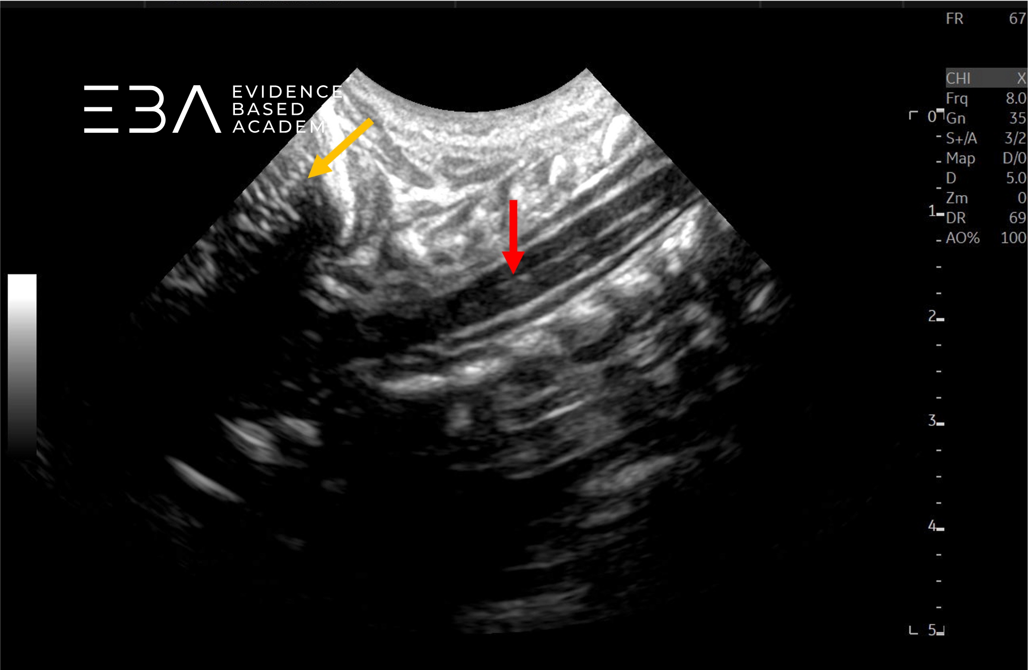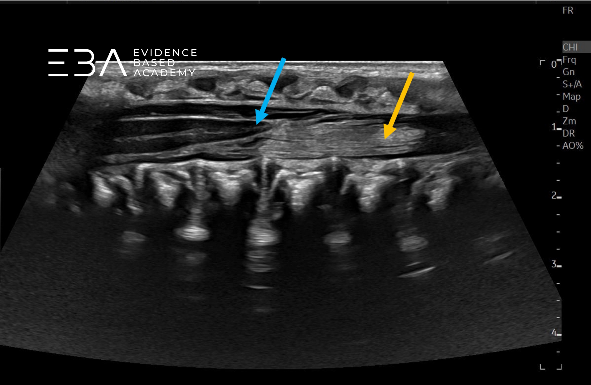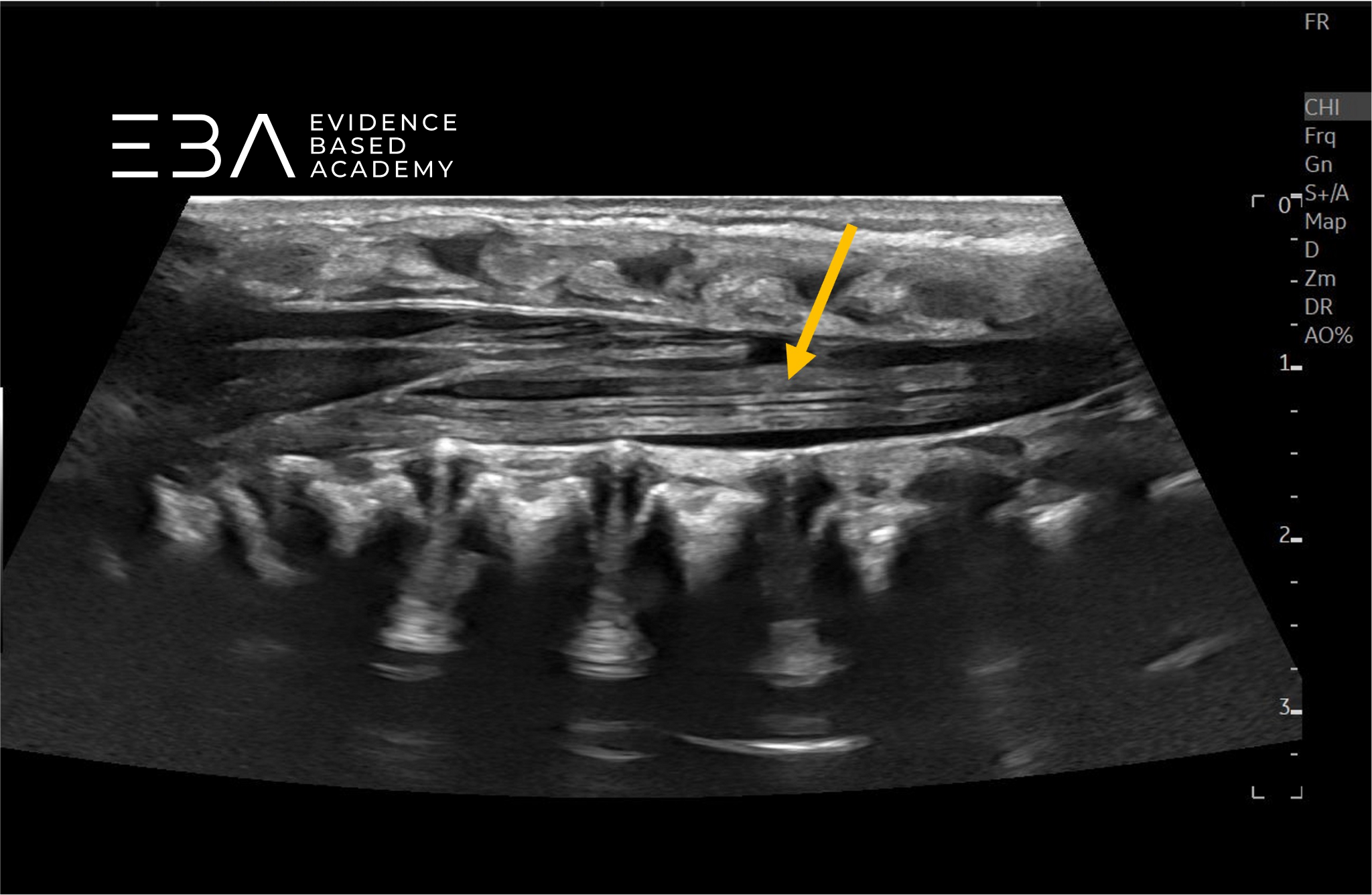 Typowa głębokość obrazowania wynosi 3-5 cm, a strefę ogniskowania ustawia się na 1,5-2,5 cm. Wzmocnienie należy dostosować tak, aby umożliwić wyraźne różnicowanie struktur wewnątrzoponowych, takich jak rdzeń kręgowy i korzenie nerwowe. Rutynowe badanie obejmuje skanowanie w płaszczyźnie strzałkowej i poprzecznej od połączenia czaszkowo-szyjnego do końca kości guzicznej, włącznie ze stożkiem rdzenia, ogonem końskim i kością guziczną.