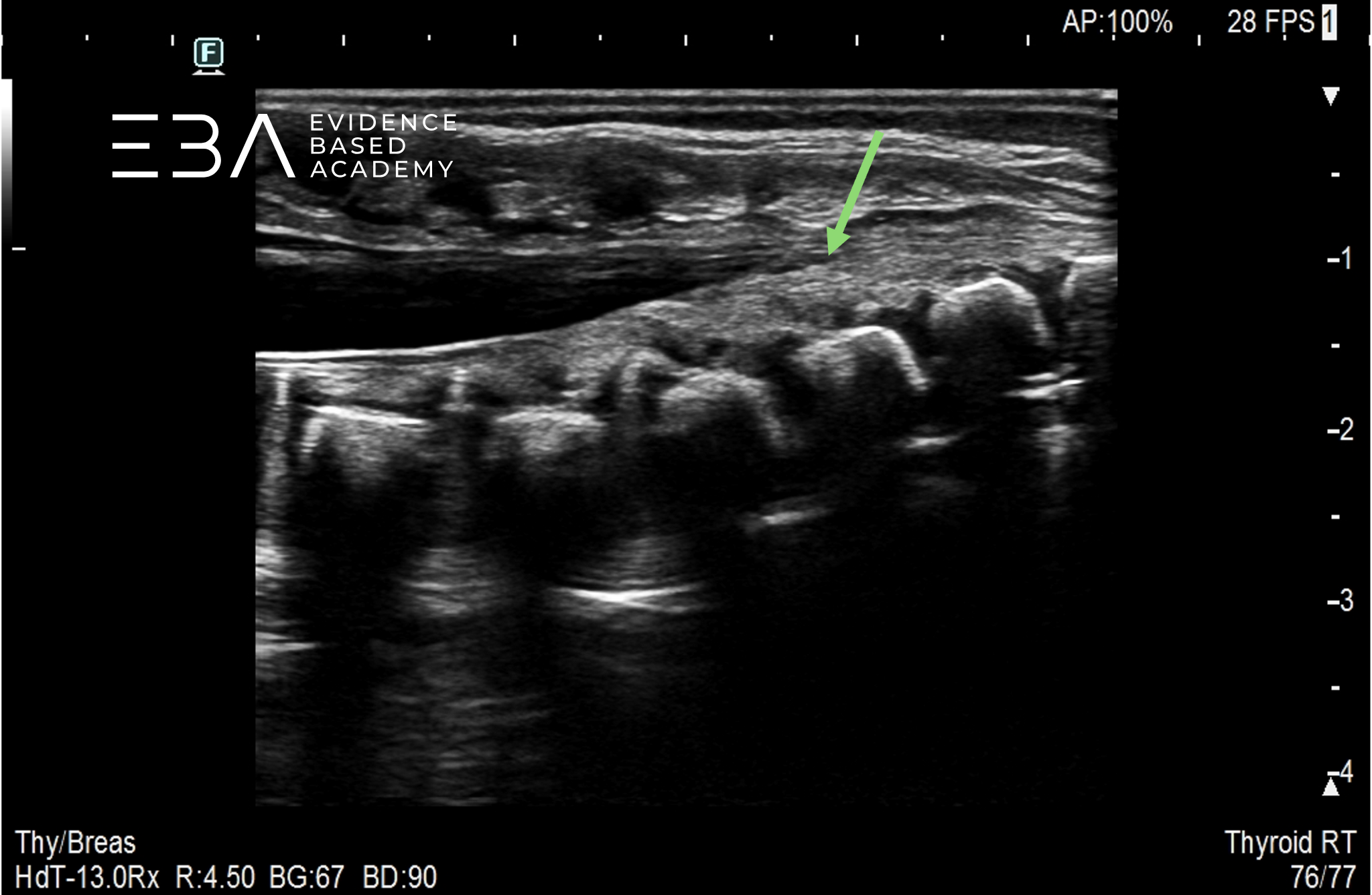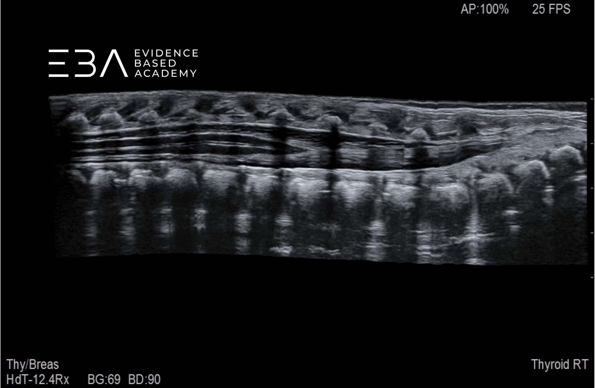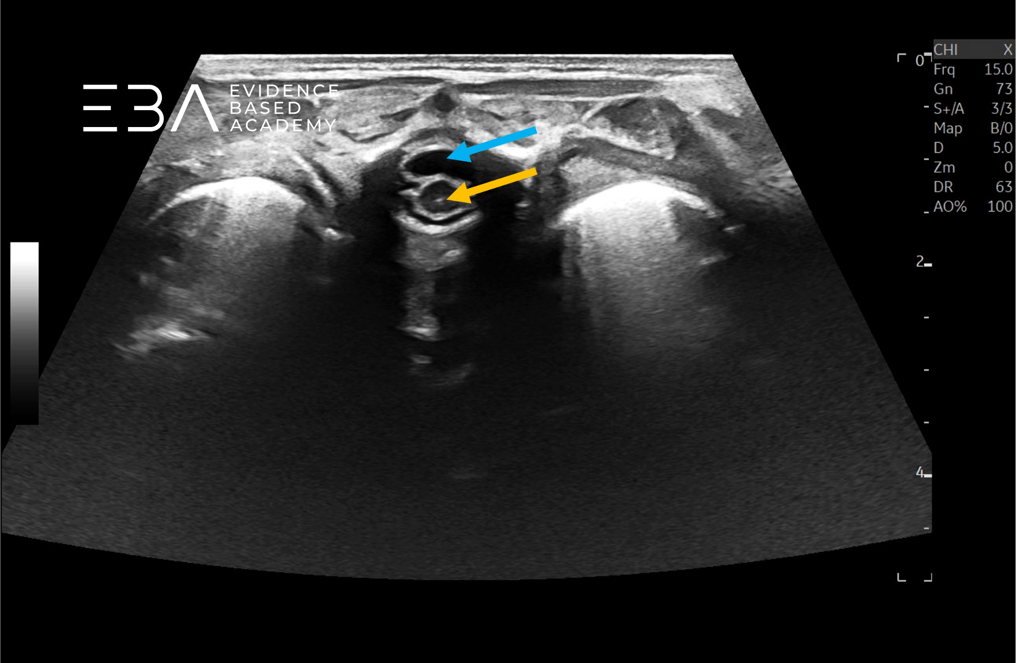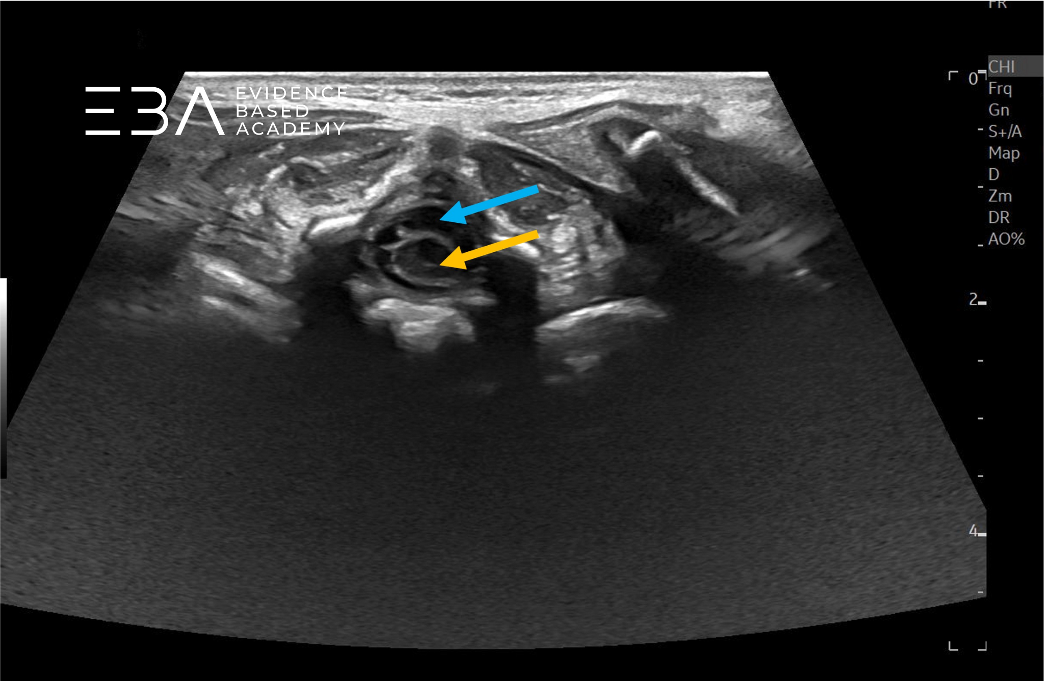 Typowa głębokość obrazowania wynosi 3-5 cm, a strefę ogniskowania ustawia się na 1,5-2,5 cm. Wzmocnienie należy dostosować tak, aby umożliwić wyraźne różnicowanie struktur wewnątrzoponowych, takich jak rdzeń kręgowy i korzenie nerwowe. Rutynowe badanie obejmuje skanowanie w płaszczyźnie strzałkowej i poprzecznej od połączenia czaszkowo-szyjnego do końca kości guzicznej, włącznie ze stożkiem rdzenia, ogonem końskim i kością guziczną.