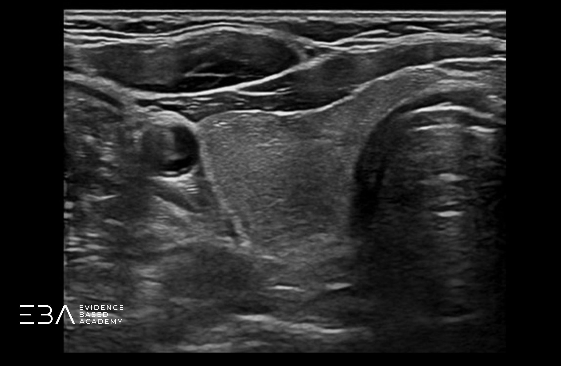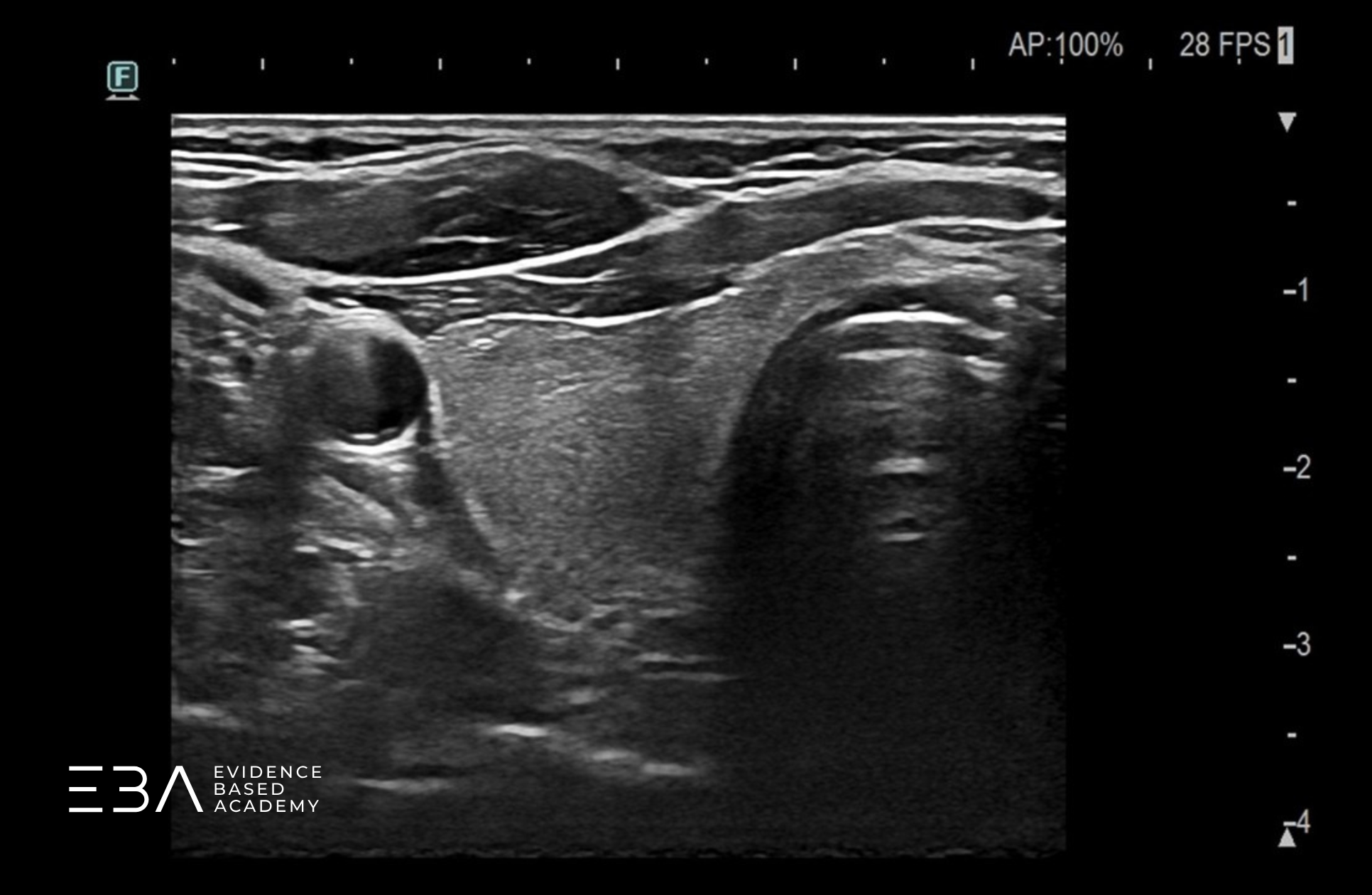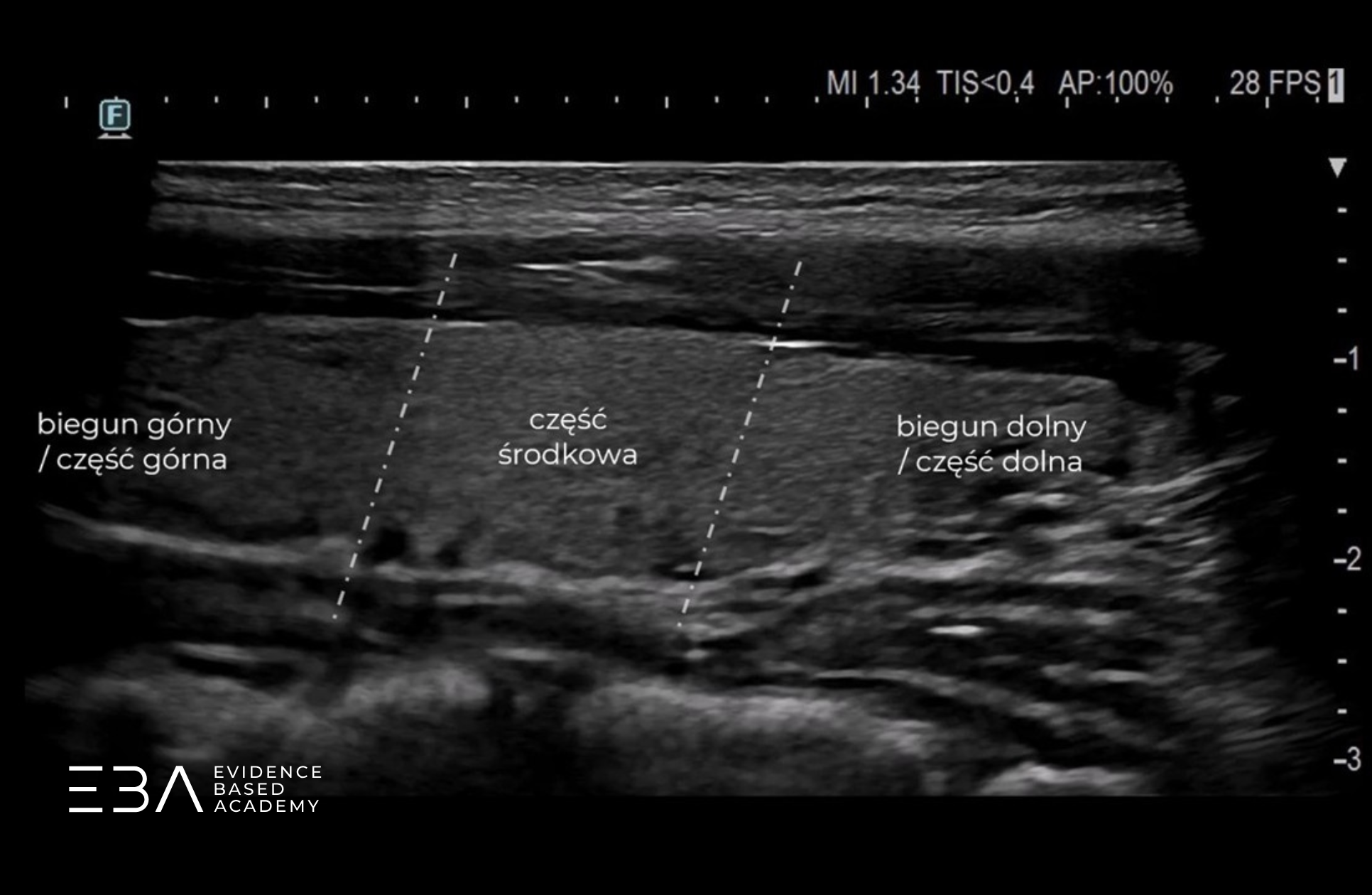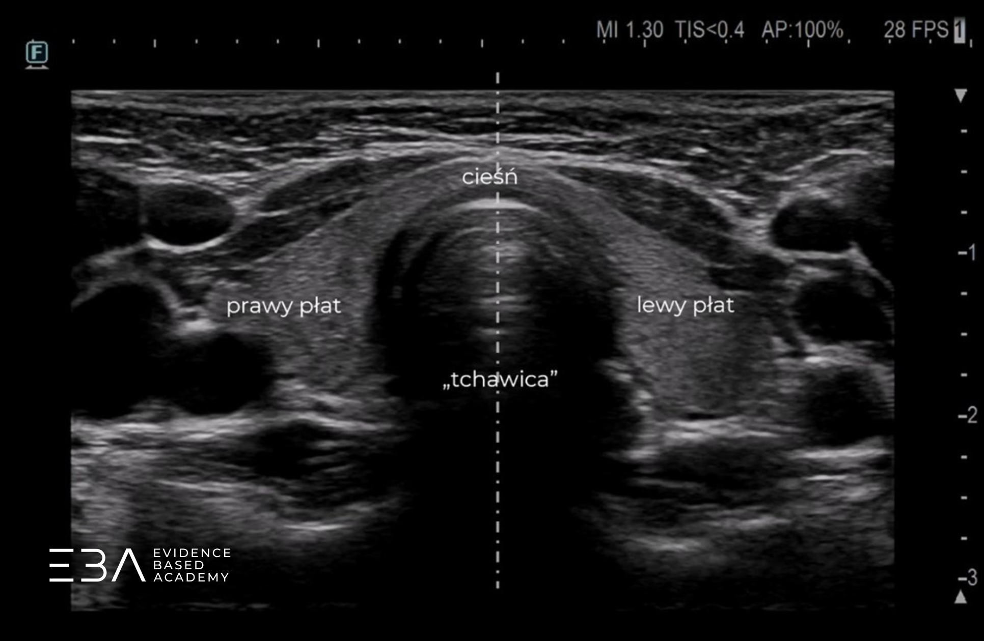 Po identyfikacji struktur w linii pośrodkowej przechodzimy do obrazowania tarczycy. Każdy z płatów skanujemy osobno w projekcjach poprzecznej i podłużnej, a następnie oceniamy cieśń.