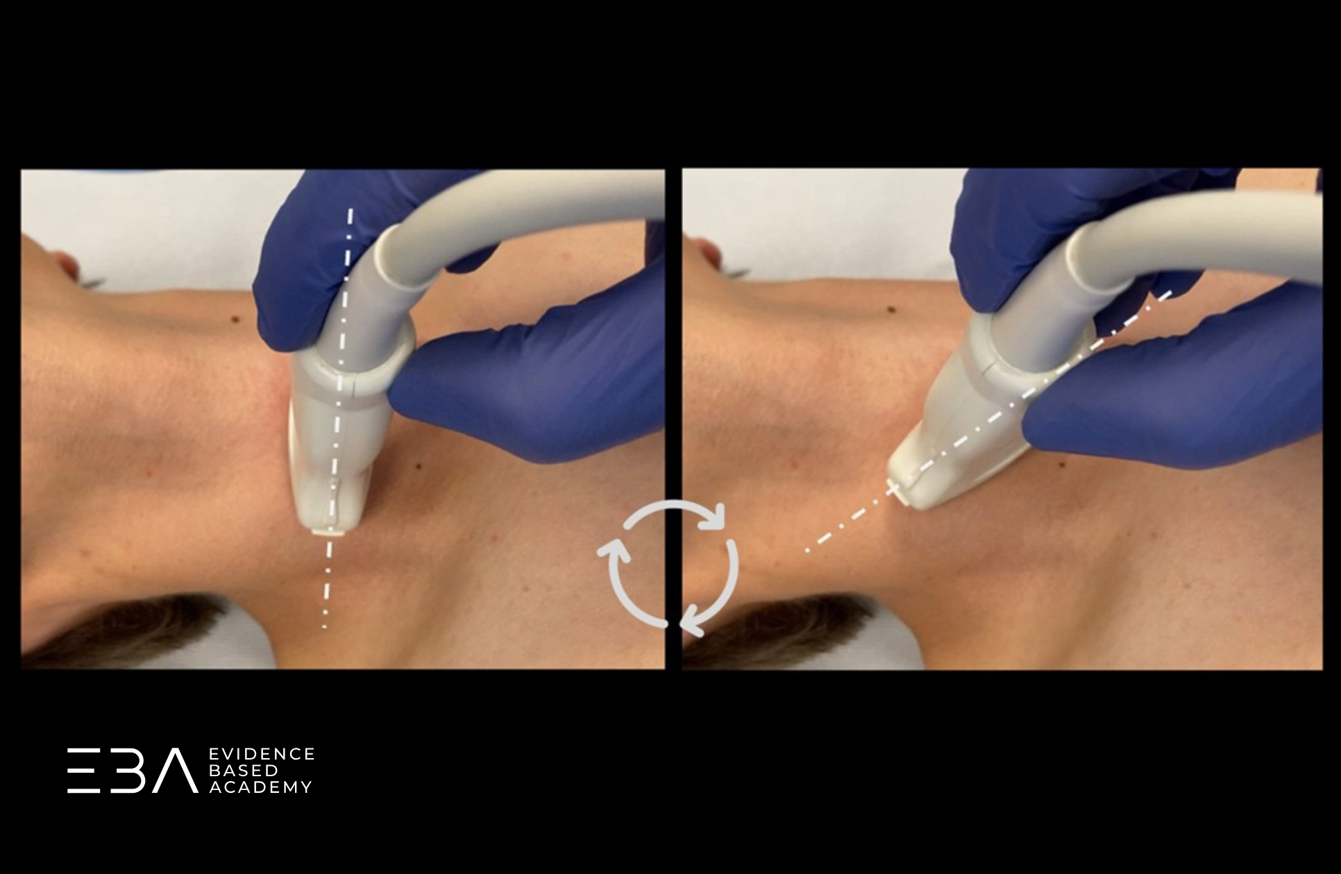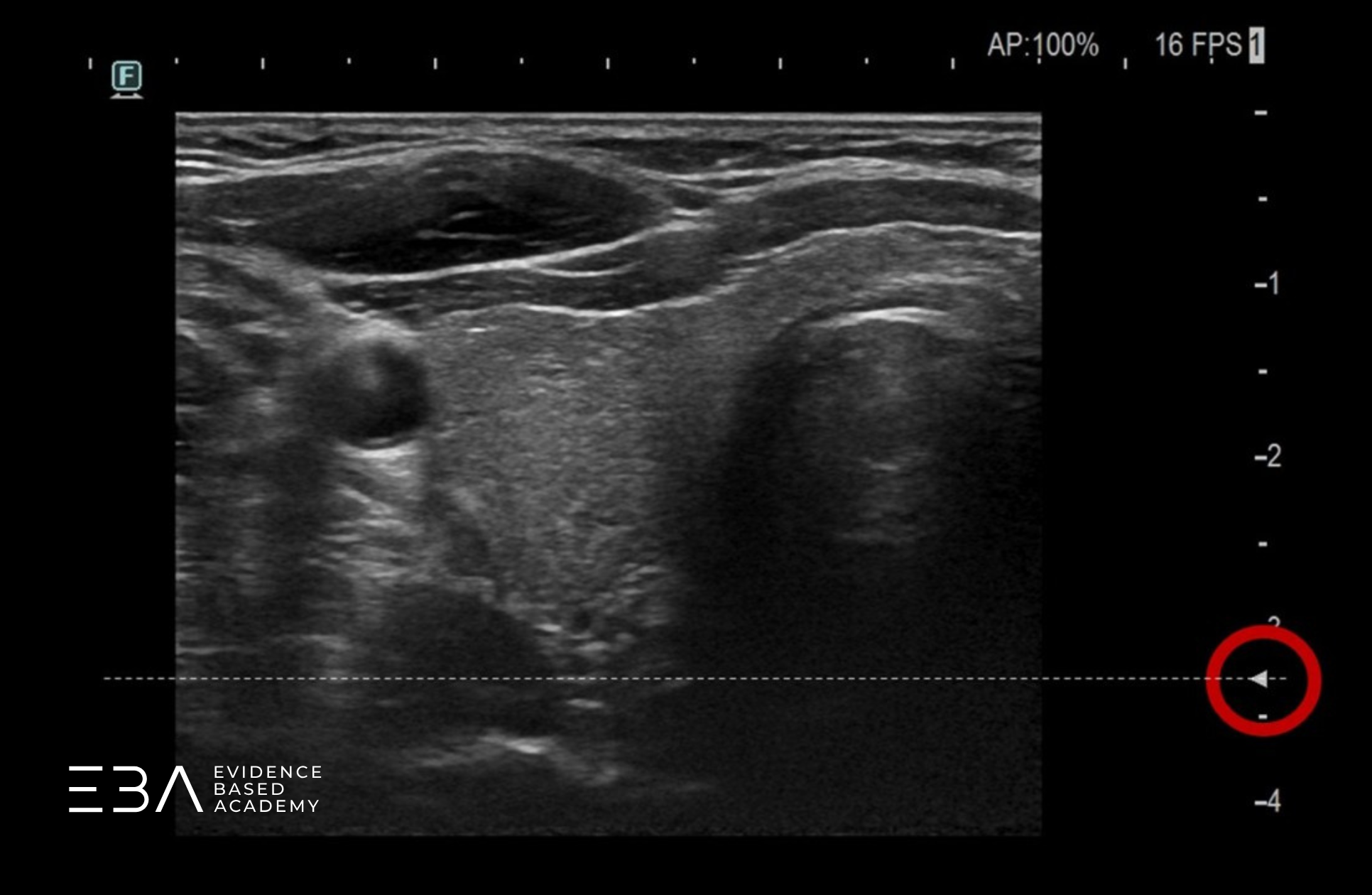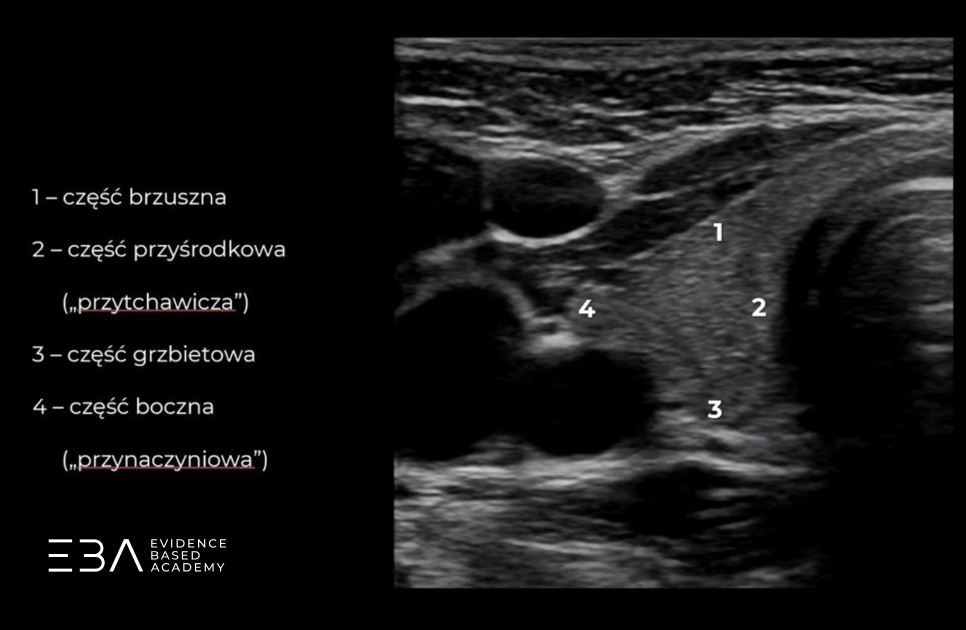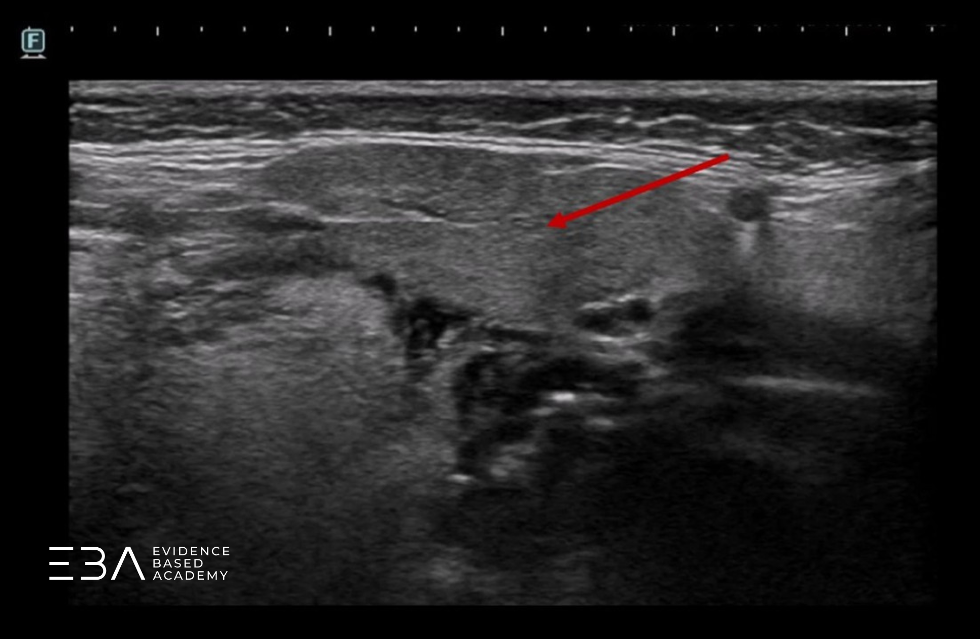 Po identyfikacji struktur w linii pośrodkowej przechodzimy do obrazowania tarczycy. Każdy z płatów skanujemy osobno w projekcjach poprzecznej i podłużnej, a następnie oceniamy cieśń.