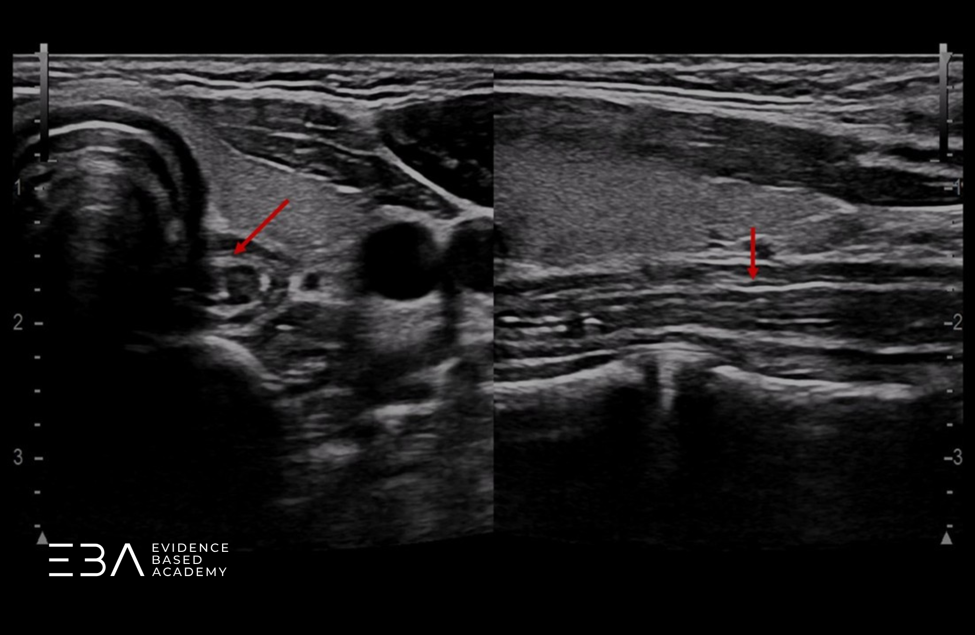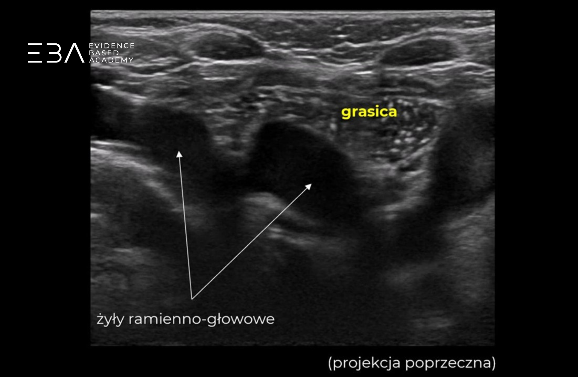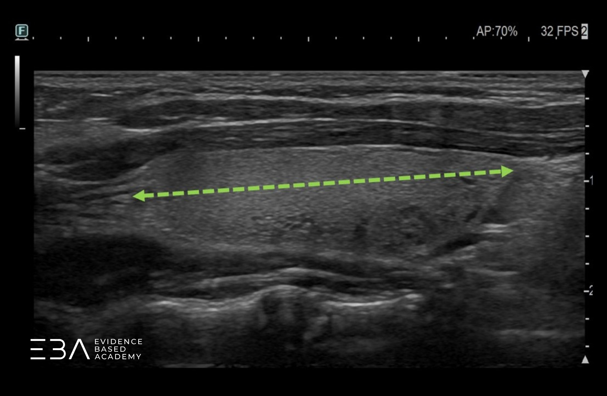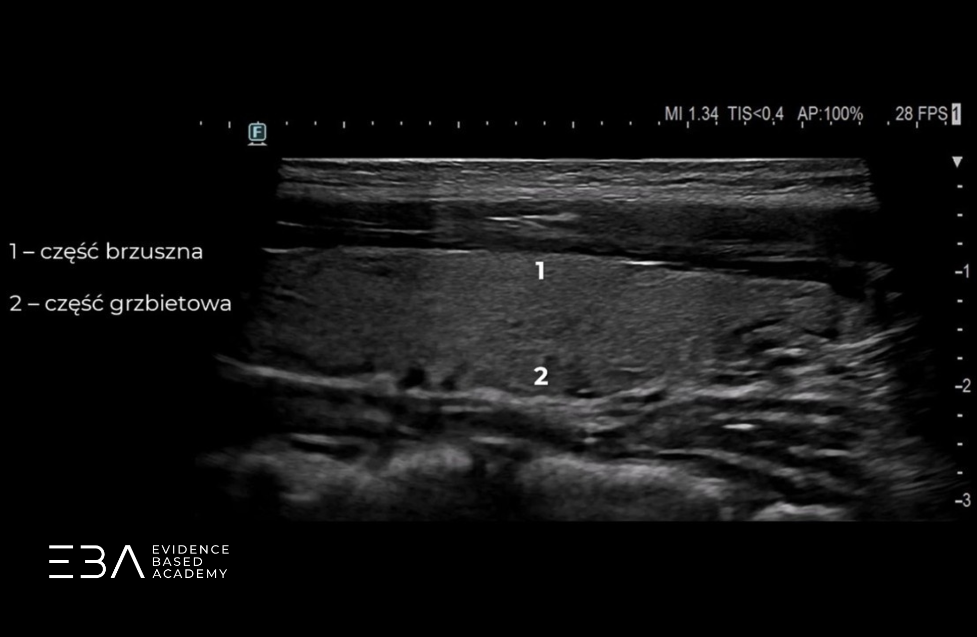 Po identyfikacji struktur w linii pośrodkowej przechodzimy do obrazowania tarczycy. Każdy z płatów skanujemy osobno w projekcjach poprzecznej i podłużnej, a następnie oceniamy cieśń.