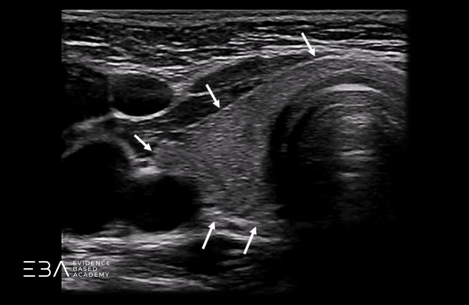 Warto zwrócić uwagę na strukturę położoną grzbietowo do tarczycy, zwykle po lewej stronie szyi. Przełyk, bo o nim mowa, w projekcji poprzecznej może początkowo imitować zmianę ogniskową. Zmiana projekcji na podłużną pozwala uwidocznić jego charakterystyczny kształt i rozwiać wątpliwości.