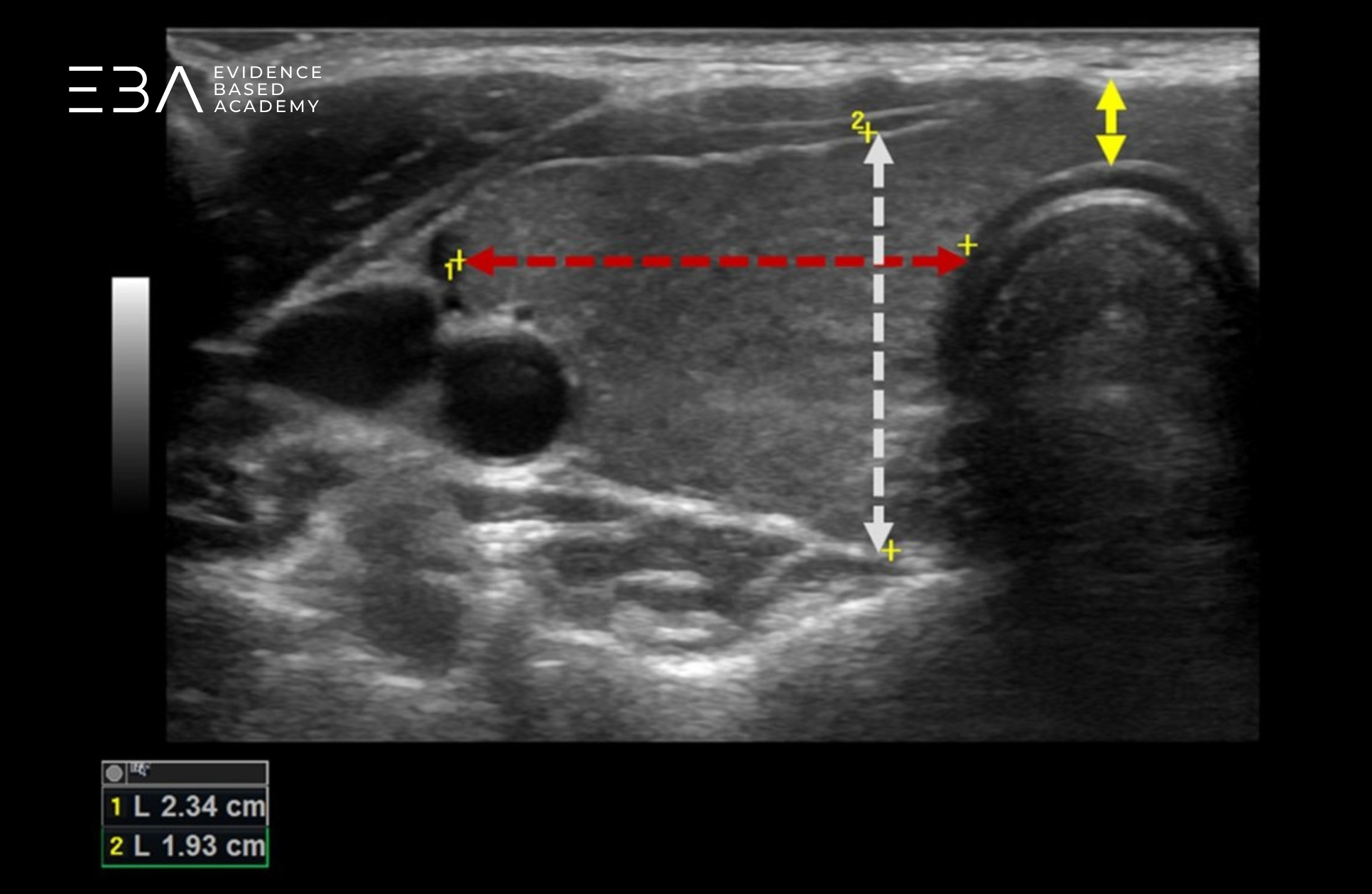 Podstawową częścią badania USG tarczycy jest określenie jej wymiarów. Każdorazowo powinniśmy zmierzyć prawy i lewy płat tarczycy w obu projekcjach – poprzecznej i podłużnej – oraz określić grubość cieśni w przekroju poprzecznym.