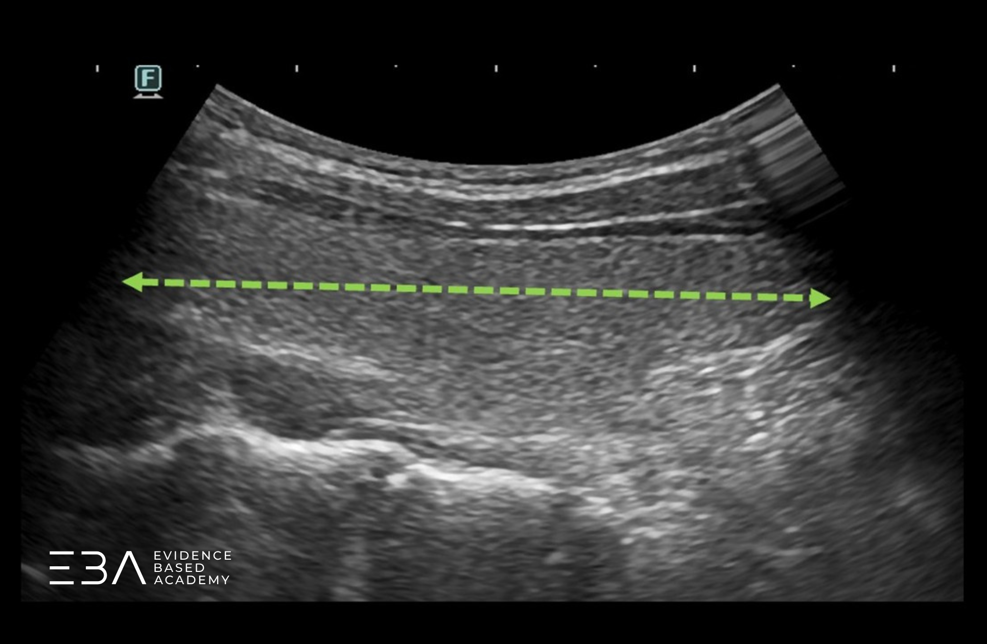 Po uzyskaniu właściwej projekcji podłużnej przechodzimy do skanowania płata w jego osi długiej. Możemy to zrobić na dwa sposoby. Pierwszy polega na przesuwaniu głowicy bocznie i przyśrodkowo, bez zmiany kąta przyłożenia głowicy do skóry.