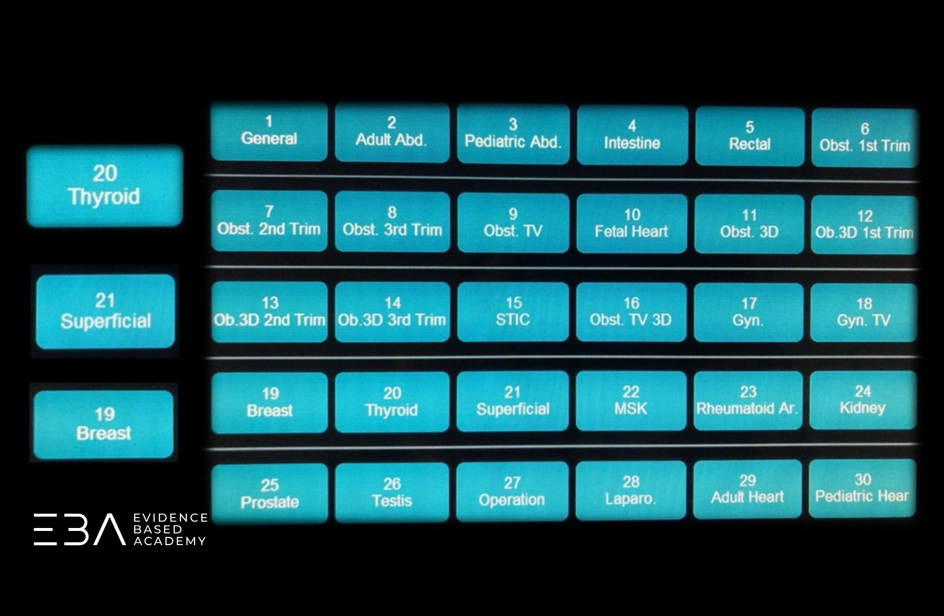 Po właściwym ułożeniu pacjenta i wyborze głowicy musimy dobrać odpowiedni Preset do badania. Rekomendowany jest preset „Thyroid”, niemniej pomocne mogą okazać się inne presety stworzone do obrazowania narządów powierzchownych np. „Superficial”, „Breast”. W przypadku znacznego powiększenia tarczycy lub nadmiernie rozwiniętej tkanki podskórnej możemy wykorzystać preset „Abdominal”, dzięki któremu lepiej uwidocznimy struktury położone głęboko.