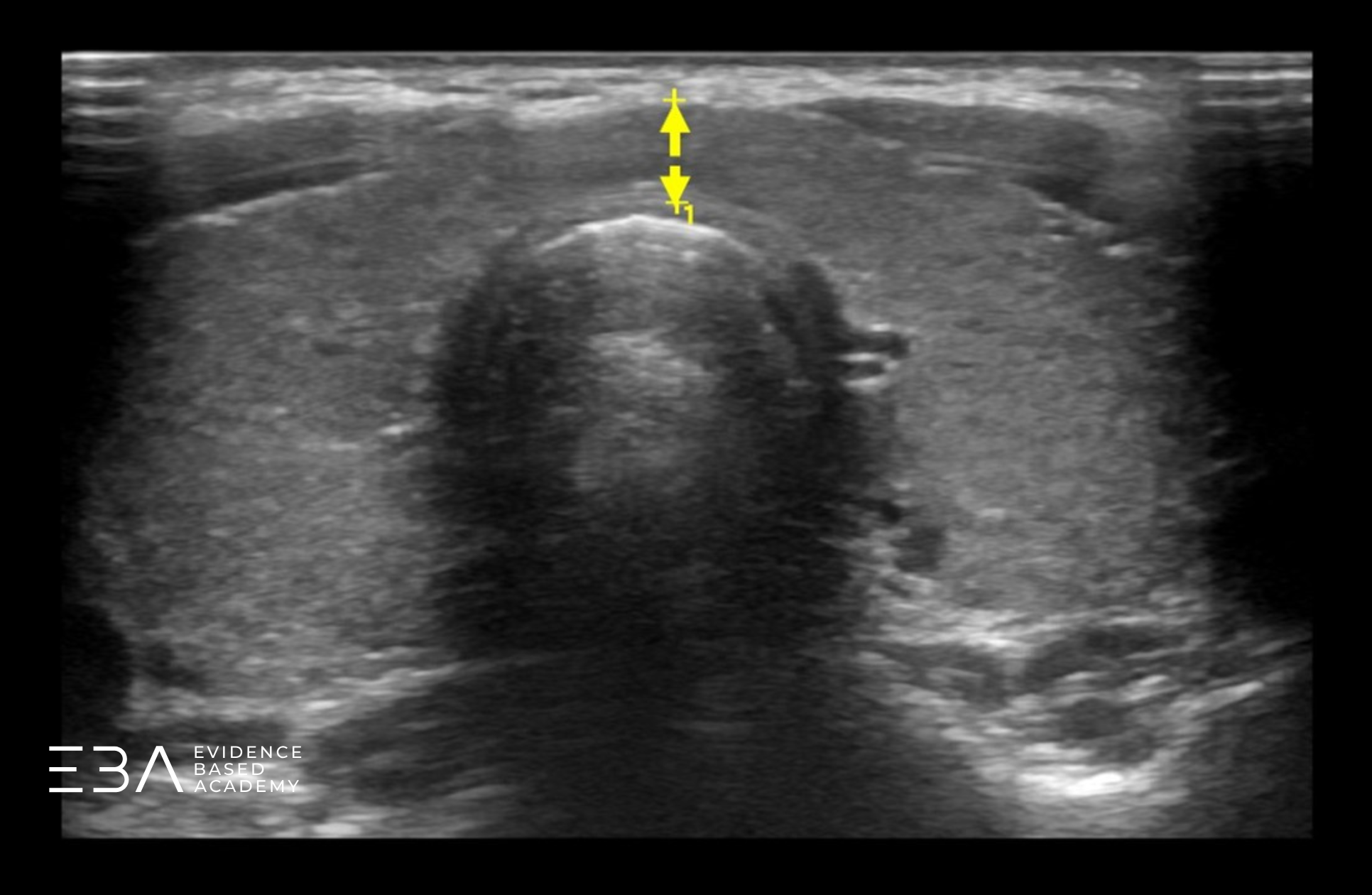 Torebka tarczycy w warunkach prawidłowych widoczna jest jako hiperechogeniczna, cienka linia oddzielająca miąższ tarczycy od struktur otaczających. Jej zarys jest gładki i regularny, możliwy do prześledzenia w każdej części tarczycy.