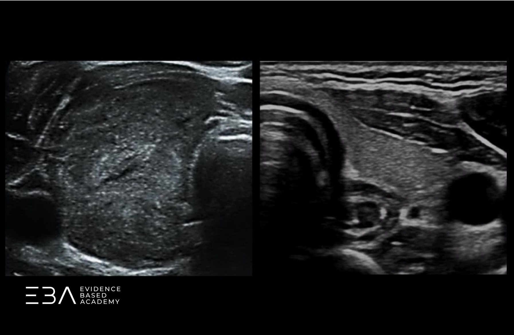 W kolejnym kroku przechodzimy do oceny miąższu tarczycy. Zaczynamy od analizy zarysu torebki, następnie określamy echogeniczność, echostrukturę, unaczynienie i wymiary, a na końcu przechodzimy do oceny zmian ogniskowych, jeśli są obecne. Taki schemat pozwala nie pominąć żadnego z elementów badania – w myśl zasady „od ogółu do szczegółu”.